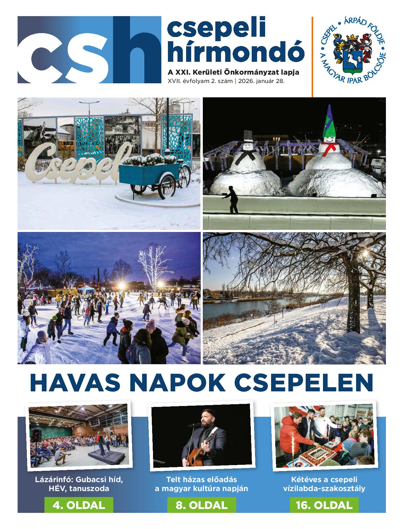 Megjelent a Csepeli Hírmondó legfrissebb száma. A tartalomból: A tárasasházaknak mielőbb rendeznie kell a kukatárolást, Lomtalanítás Csepelen, Csórics Balázs: A vers gyógyír minden bajra, Portrék, mesehősök, varázsvilág, Újra a jégen, Téli balesetetek: Hogyan kerülhetők el?. Jóga és tárlatvezetés, Otthon, elegancia, alkotás, programajánló, rejtvény. Legközelebbi számunk február 11-én jelenik meg.